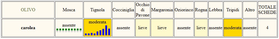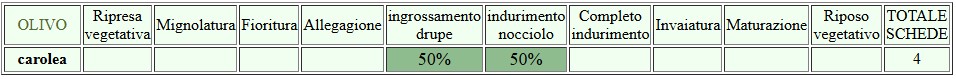 Tignola: nelle trappole le catture sono lievemente diminuite. Comunque, bisogna monitorare le ovideposizioni sul calice delle olivine, alle quali seguirà la nascita delle larvette dopo 3-7 giorni. Quindi, solo dopo il superamento della soglia di intervento (10-15% di uova o larvette in fase di penetrazione) si potrà intervenire, possibilmente entro la fase di preindurimento del nocciolo.