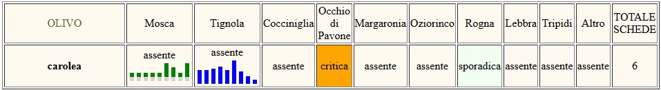 In zona costiera e bassa collina: continua l'ingrossamento delle drupe. Nulla da segnalare oltre la maggiore visibilità dell'endemico Occhio di pavone; in alta collina indurimento del nocciolo in corso. In tutte le zone NON si consigliano trattamenti.