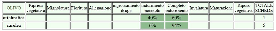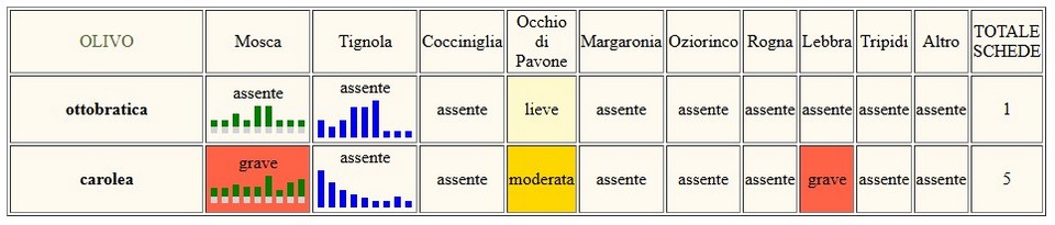 Presenza di Mosca in aumento soprattutto su Carolea, in un oliveto si registra un attacco grave. Per le particolari condizioni microclimatiche sullo stesso appezzamento di registra una grave infezione di Lebbra. L' occhio di pavone resta da lieve a moderato.