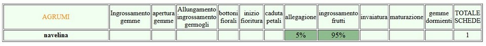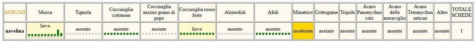 Dopo il picco di catture di Mosca della scorsa settimana la popolazione ha subito una flessione ed anche la classe di infestazione passa da moderata a lieve. Si segnala la presenza fisiologica di cocciniglia rosso forte e Minatrice.