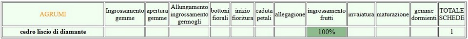 Nell'appezzamento monitorato la mancanza di un impianto irriguo nella cedriera condiziona, in ragione delle elevate temperature, lo sviluppo vegetativo delle piante e la crescita dei frutti; si rileva una leggera presenza di minatrice serpentina (Phillocnistis citrella).