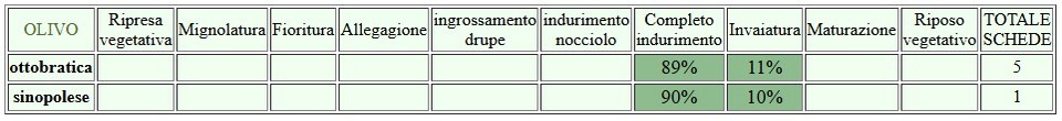 Le infezioni di Occhio di pavone (Venturia oleaginea) appaiono stabili rispetto alle passate settimane. Poiché le condizioni meteo possono aver dato inizio a nuove infezioni di Occhio di Pavone, è necessario attendere la comparsa delle macchie sulle foglie prima di effettuare il trattamento.