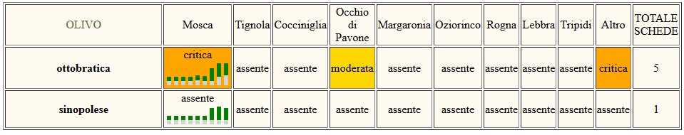 Mosca dell'olivo (Bactrocera oleae): Nell’ultima settimana si registrano numerose catture nelle trappole a feromone, dal campionamento delle drupe nei siti monitorati, è emersa una percentuale di infestazione attiva superiore alla soglia di intervento, che:
