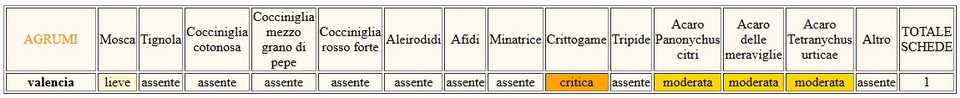 Mosca della frutta (Ceratitis capitata) Nelle trappole al trimedlure si rileva un'elevata presenza di adulti, si consiglia pertanto di intervenire tempestivamente, nella fase di pre-invaiatura, sull’intera superficie con interventi adulticidi per abbassare la popolazione della mosca. Le varietà di agrumi più precoci iniziano a invaiare e ciò rende i frutti suscettibili all’ ovideposizione da parte della mosca, su queste e nelle aziende condotte con il metodo biologico, si raccomanda di effettuare interventi settimanali utilizzando spinosad esca, altra possibilità di lotta biologica è data dalle trappole per la cattura massale o attract and kill.