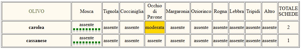 Occhio di pavone: infezioni su “Carolea” varietà molto suscettibile, da sporadica a moderata soprattutto nelle aree collinari in prossimità di vallate e corsi d’acqua con presenza di umidità e aumento delle infezioni; in questi casi in post raccolta un trattamento con prodotti rameici alle dosi in etichetta. Bactrocera Oleae (Mosca dell’Olivo) : su Carolea e Cassanese infezioni lievi con 2-4 punture attive in media.