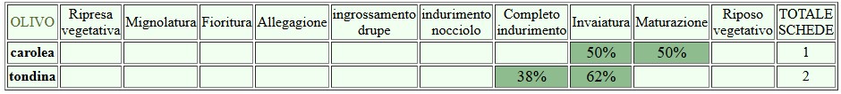 Su olivo prosegue la fase di inolizione delle drupe con viraggio di colore più o meno accentuato a seconda delle diverse cultivar. La situazione fitoiatrica non si discosta dalle scorse settimane, con una presenza, in leggera diminuzione, degli adulti di Bactrocera oleae, mentre è stabile il danno sulle drupe; sono in corso di programmazione o di effettuazione le raccolte degli appezzamenti nei diversi areali.