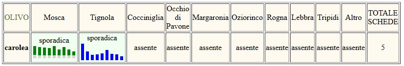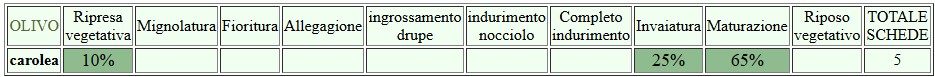 Le operazioni di raccolta procedono. Sia le catture di Mosca che di Tignola nelle trappole a feromoni sono quasi nulle. A fine raccolta si consiglia di effettuare un trattamento rameico di chiusura per prevenire e contenere i patogeni fungini dell’olivo: Occhio di pavone, Piombatura, Lebbra, Rogna, soprattutto nelle zone ad elevata umidità, scarsamente ventilate.