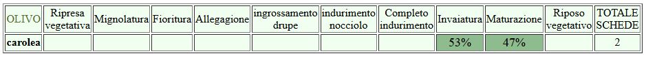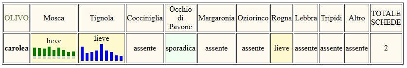 Con l’avanzare della raccolta, le catture di MoscaMosca e di TignolaTignola nelle trappole a feromoni sono scarse, probabilmente perché l’attività di ovideposizione si sta concludendo. A fine raccolta si consiglia di effettuare un trattamento rameico di chiusura per prevenire e contenere i patogeni fungini dell’olivo: Occhio di pavone, Piombatura, Lebbra, Rogna, soprattutto nelle zone ad elevata umidità, scarsamente ventilate.