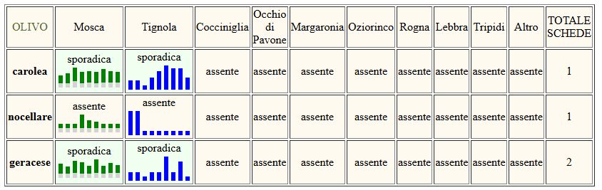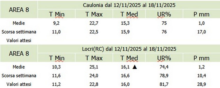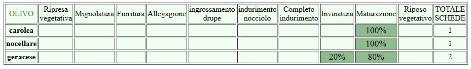 Mosca dell’olivo: Il monitoraggio effettuato per mezzo di indagine visiva, trappole a feromone e trappole cromotropiche ha evidenziato una drastica riduzione della presenza del dittero anche in conseguenza delle ultime condizioni meteo con eventi piovosi ed abbassamento delle temperature. Su varietà a frutto con elevato rapporto polpa/nocciolo si evidenzia una significativa quantità di drupe interessate da "taccone", con foro di sfarfallamento della Bactrocera. Considerato il grado di maturazione e il relativo tenore in olio, per tutte le varietà precoci e non, si consiglia di procedere alla raccolta ove non già in atto o conclusa.